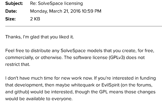 I've attached my complete email excerpted in the video linked above. Everyone is indeed free to use models created in SolveSpace for any purpose, commercial or noncommercial. The software itself is licensed under the GPLv3 though. So if a binary derivative work is distributed, then the source must be distributed under the GPL. Any IP lawyer can confirm this.